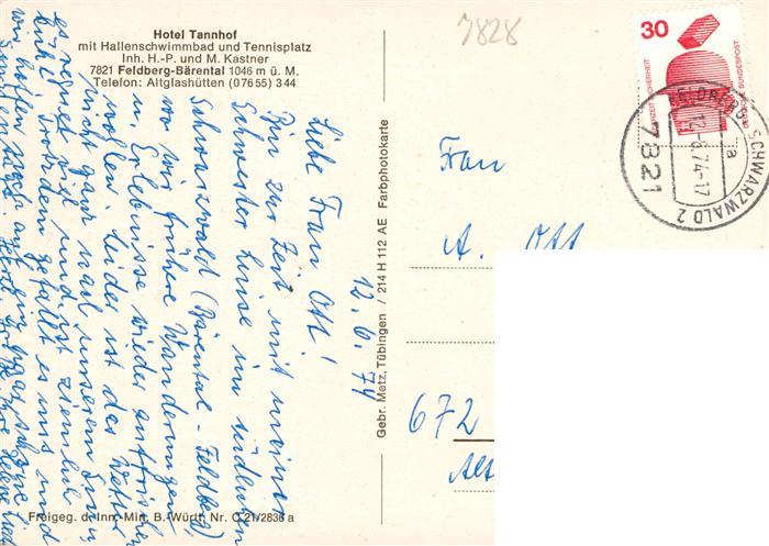 73931195 alte Postkarte Baerental Feldberg Hotel Tannenhof Fliegeraufnahme postalisch gelaufen Erhaltung siehe scans [WerneD78] KatCode: 11110008315037