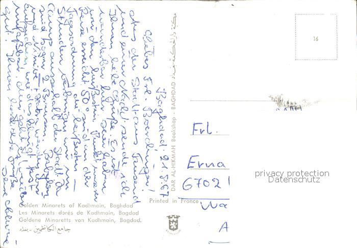 alte Postkarte Bagdad Baghdad Golden Minarets of Kadhmain postalisch gelaufen Erhaltung siehe scans