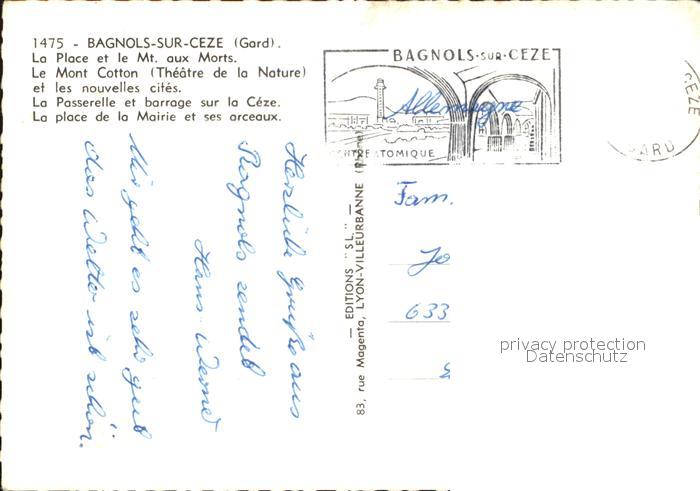 12596387 carte postale Bagnols-sur-Ceze Place et le Mt aux Morts Mont cotton Passerelle et barrage sur la Ceze Place de la Mairie postalisch gelaufen Erhaltung siehe scans [WerneD78] KatCode: 11170030230028