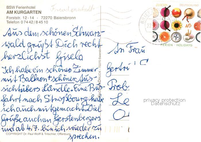73834583 alte Postkarte Baiersbronn Schwarzwald BSW Ferienhotel am Kurgarten postalisch gelaufen Erhaltung siehe scans [FriedD77] KatCode: 11110008237004