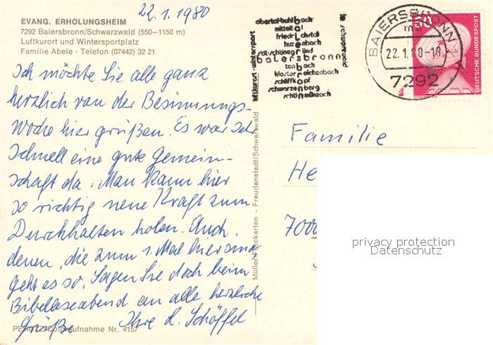 73653103 alte Postkarte Baiersbronn Schwarzwald Ev Erholungsheim postalisch gelaufen Erhaltung siehe scans [WerneD78] KatCode: 11110008237004