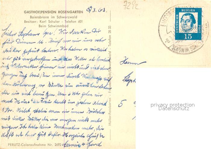 73725021 alte Postkarte Baiersbronn Schwarzwald Gasthof Pension Rosengarten postalisch gelaufen Erhaltung siehe scans [FriedD77] KatCode: 11110008237004