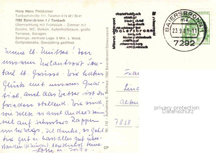 72900319 alte Postkarte Baiersbronn Schwarzwald Haus Hans Finkbeiner postalisch gelaufen Erhaltung siehe scans [LiesaD40] KatCode: 11110008237004