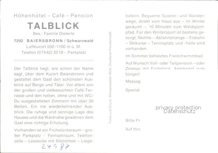 72014760 Baiersbronn Schwarzwald Hoehenhotel Cafe Talblick postalisch nicht gelaufen Werbekarte (keine Postkarte) Erhaltung siehe scans KatCode: 11110008237004