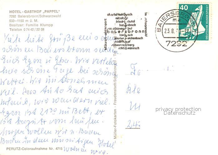 73164994 alte Postkarte Baiersbronn Schwarzwald Hotel Gasthof Pappel postalisch gelaufen Erhaltung siehe scans [WerneD78] KatCode: 11110008237004