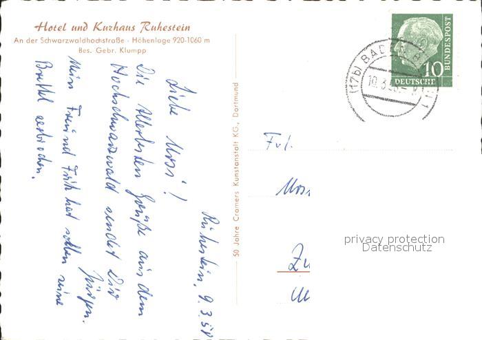 72402037 alte Postkarte Baiersbronn Schwarzwald Hotel und Kurhaus Ruhestein postalisch gelaufen Erhaltung siehe scans KatCode: 11110008237004
