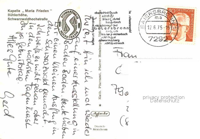 72755582 alte Postkarte Baiersbronn Schwarzwald Kapelle Maria Frieden Buehlerhoehe postalisch gelaufen Erhaltung siehe scans [WerneD78] KatCode: 11110008237004