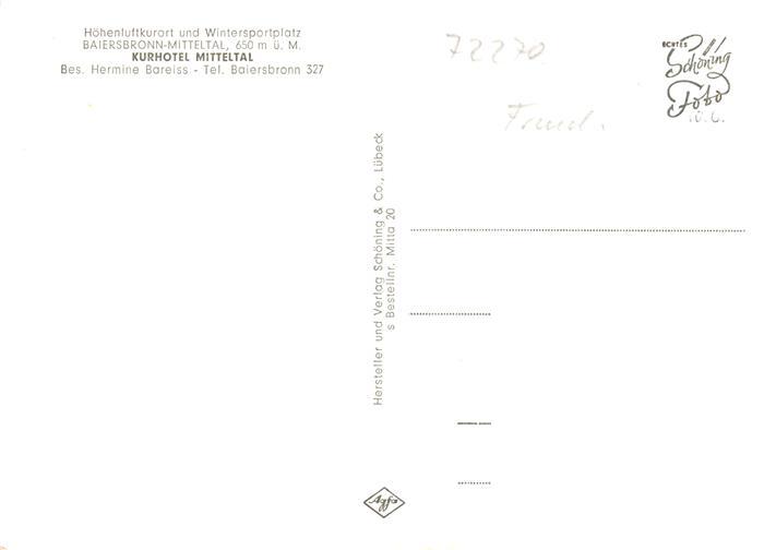 73888174 Baiersbronn Schwarzwald Kurhotel Mitteltal Restaurant postalisch nicht gelaufen Erhaltung siehe scans [FriedD77] KatCode: 11110008237004