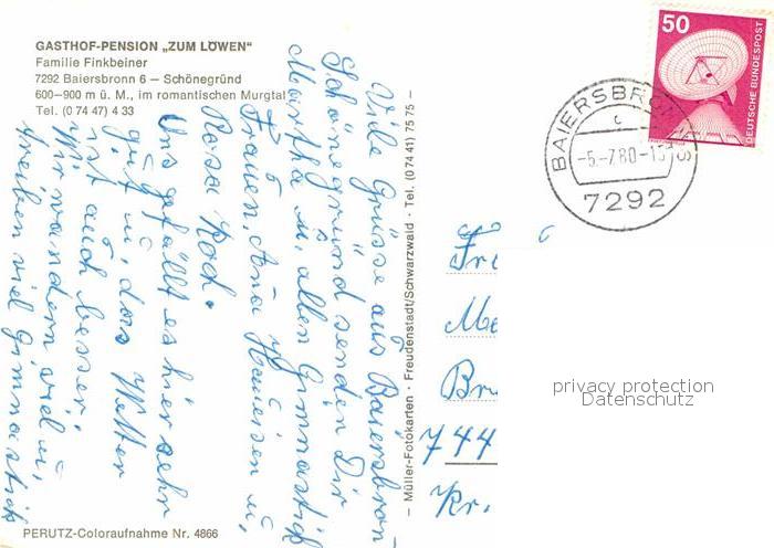 72896920 alte Postkarte Baiersbronn Schwarzwald Schoenegruend Gasthof Pension zum Loewen postalisch gelaufen Erhaltung siehe scans [KathaD81] KatCode: 11110008237004