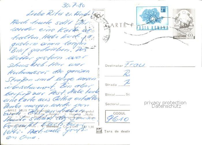 old postcard Baile Felix Strandul Piscine Apollo Hotel Nufarul postalisch gelaufen Erhaltung siehe scans