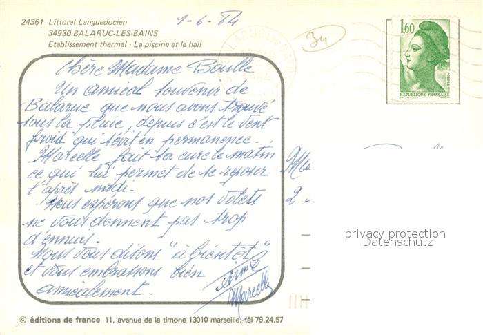 13230542 carte postale Balaruc-les-Bains Etablissement thermal Piscine et le hall postalisch gelaufen Erhaltung siehe scans [FriedD77] KatCode: 11170034334023
