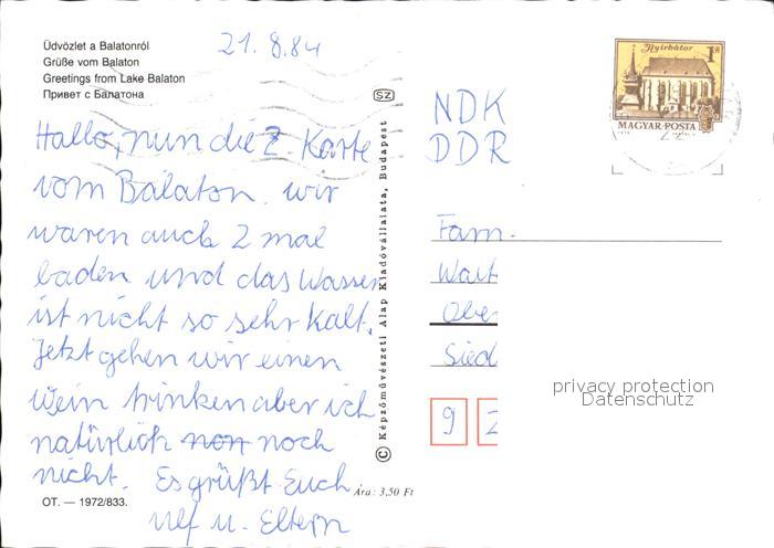 old postcard Balaton Plattensee Post Denkmal Faehrschiff postalisch gelaufen Erhaltung siehe scans
