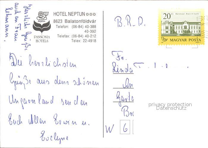 old postcard Balatonfoeldvar Hotel Neptun Segelschiffe Park Pool postalisch gelaufen Erhaltung siehe scans