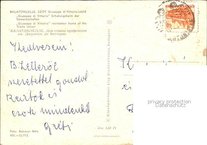 old postcard Balatonlelle Szot Guiseppe di Vittoria uedueloe Erholungsheim der Gewerkschaften postalisch gelaufen Erhaltung siehe scans