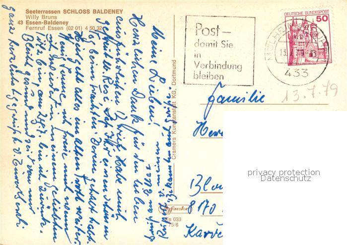 73072515 alte Postkarte Baldeneysee Seeterrassen Schloss Baldeney Gaststuben postalisch gelaufen Erhaltung siehe scans [WerneD78] KatCode: 11110005113000