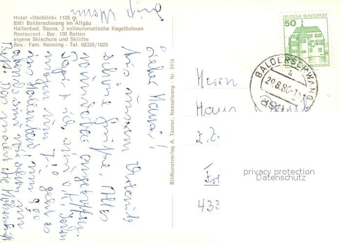 73653642 alte Postkarte Balderschwang Hotel Ifenblick Restaurant Hallenbad postalisch gelaufen Erhaltung siehe scans [FriedD77] KatCode: 11110009780113