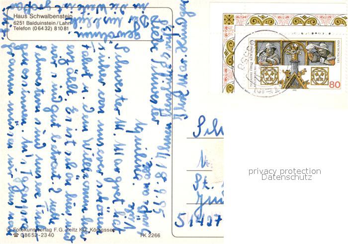 73011108 alte Postkarte Balduinstein Haus Schwalbenstein postalisch gelaufen Erhaltung siehe scans [WerneD78] KatCode: 11110007141503