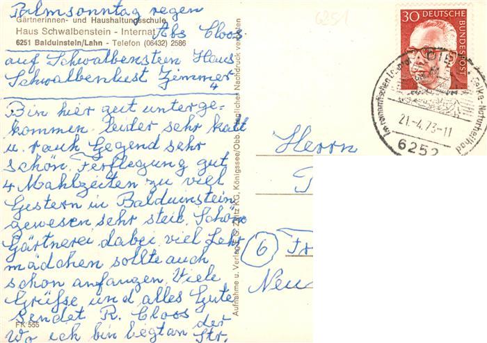 73936500 alte Postkarte Balduinstein Haus Schwalbenstein Internat Haushaltungsschule postalisch gelaufen Erhaltung siehe scans [FriedD77] KatCode: 11110007141503