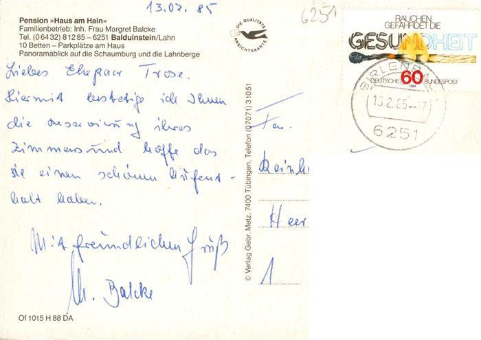 73936242 alte Postkarte Balduinstein Pension Haus am Hain postalisch gelaufen Erhaltung siehe scans [FriedD77] KatCode: 11110007141503