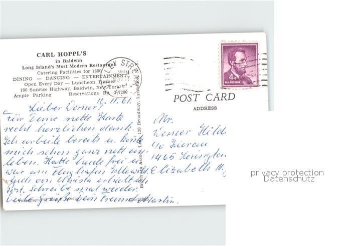 72921575 old postcard Baldwin New York Carl Hoppl Long Island Most Modern Restaurant postalisch gelaufen Erhaltung siehe scans [NatalD47] KatCode: 14140340000000