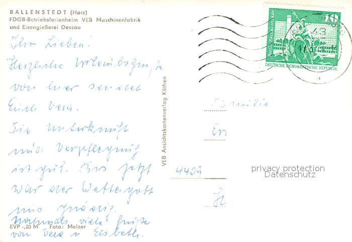 72984898 alte Postkarte Ballenstedt FDGB Betriebsferienheim VEB Maschinenfabrik und Eisengiesserei Dessau postalisch gelaufen Erhaltung siehe scans [FriedD77] KatCode: 11110015085040