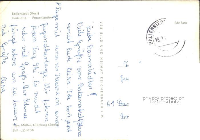 72119215 alte Postkarte Ballenstedt Heilstaette Frauenstation postalisch gelaufen Erhaltung siehe scans KatCode: 11110015085040