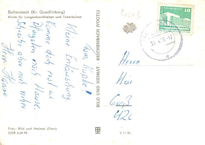 73885829 alte Postkarte Ballenstedt Kr. Quedlinburg Klinik fuer Lungenkrankheiten und Tuberkulose postalisch gelaufen Erhaltung siehe scans [NoemiOhl] KatCode: 11110015085040