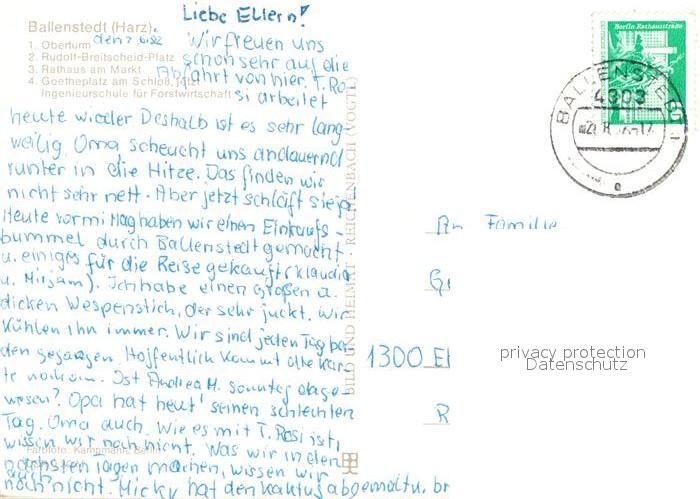 72945072 alte Postkarte Ballenstedt Oberturm Rudolf Breitscheid Platz Rathaus Goetheplatz Schloss postalisch gelaufen Erhaltung siehe scans [WerneD78] KatCode: 11110015085040
