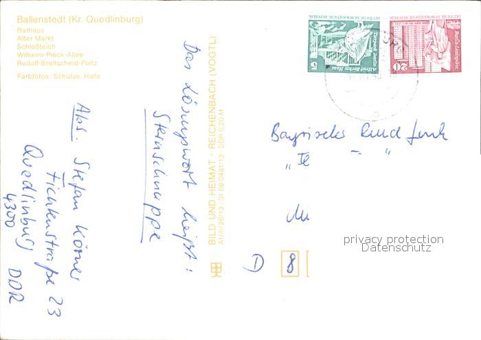 72416164 alte Postkarte Ballenstedt Rathaus Alter Markt Schlossteich Wihelm Pieck Allee postalisch gelaufen Erhaltung siehe scans KatCode: 11110015085040
