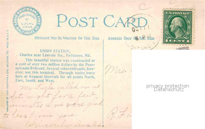 72647600 old postcard Baltimore Maryland New Union Station postalisch gelaufen Erhaltung siehe scans [FriedD77] KatCode: 14140220000000