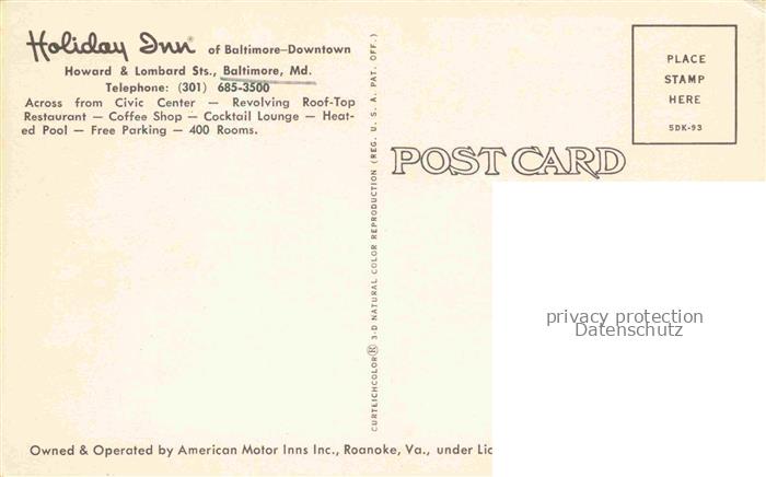 74024318 Baltimore Maryland USA Holiday Inn Hotel postalisch nicht gelaufen Erhaltung siehe scans [FriedD77] KatCode: 14140220000000