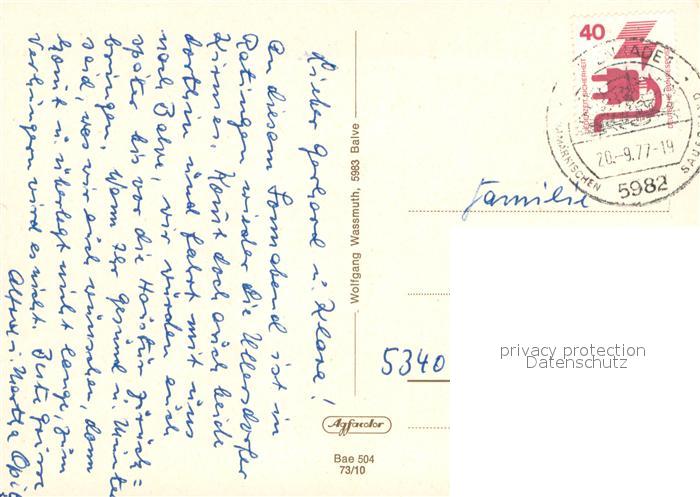 73737050 alte Postkarte Balve Glockenspiel St Blasius Kirche Blick vom Wachtloh Schulzentrum Hallenbad postalisch gelaufen Erhaltung siehe scans [FriedD77] KatCode: 11110005962008