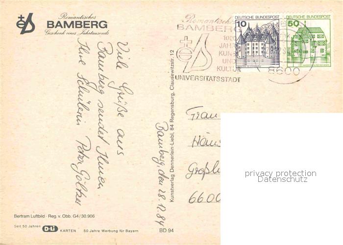 72847054 alte Postkarte Bamberg Fliegeraufnahme postalisch gelaufen Erhaltung siehe scans [NatalD47] KatCode: 11110009461000