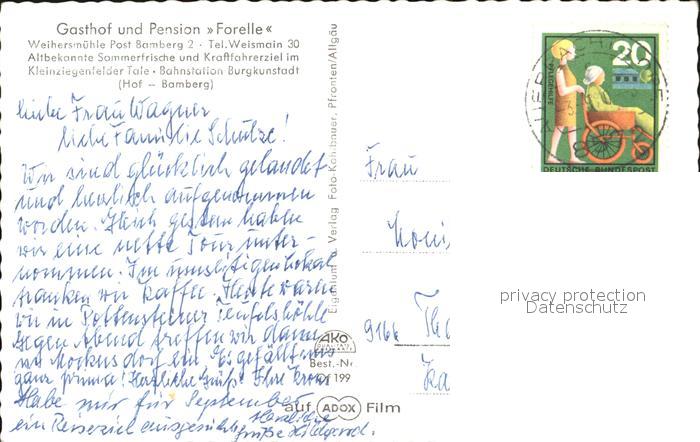 72405197 alte Postkarte Bamberg Gasthof und Pension Forelle postalisch gelaufen Erhaltung siehe scans KatCode: 11110009461000