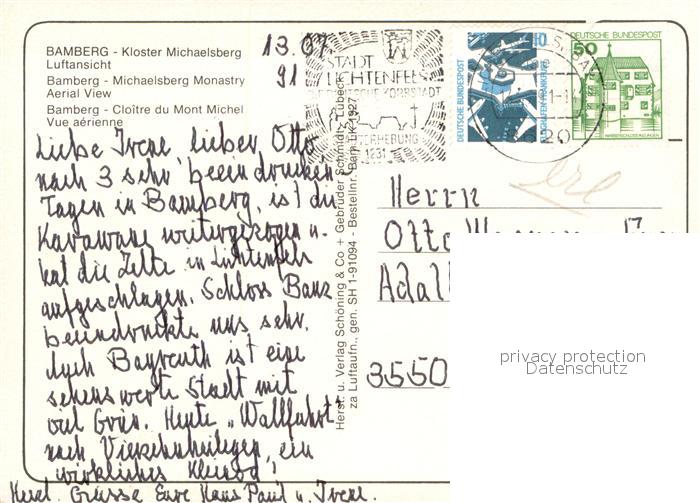 73712125 alte Postkarte Bamberg Kloster Michaelsberg Fliegeraufnahme postalisch gelaufen Erhaltung siehe scans [WerneD78] KatCode: 11110009461000