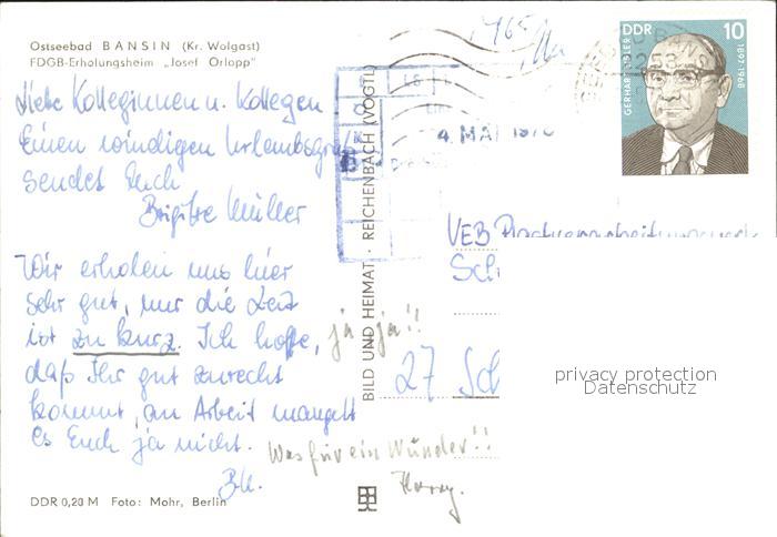 72008063 alte Postkarte Bansin Ostseebad FDGB-Erholungsheim Josef Orlopp postalisch gelaufen Erhaltung siehe scans KatCode: 11110013059112