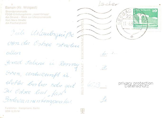73041113 alte Postkarte Bansin Ostseebad Strandpromenade FDGB Erholungsheim Josef Orlopp Strand Uferpromenade Karl Marx Platz Fischerstrand postalisch gelaufen Erhaltung siehe scans [WerneD78] KatCode: 11110013059112