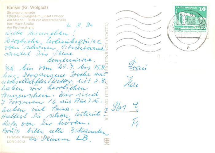 73879497 alte Postkarte Bansin Ostseebad Strandpromenade FDGB Erholungsheim Josef Orlopp Strand Uferpromenade Karl-Marx-Strasse Fischerstrand postalisch gelaufen Erhaltung siehe scans [FriedD77] KatCode: 11110013059112