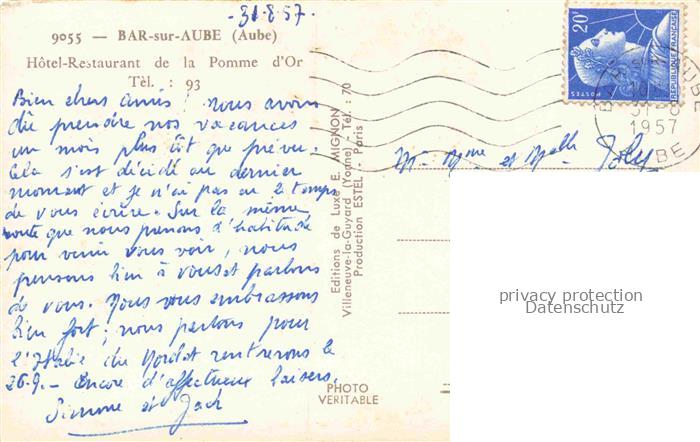 14104400 carte postale Bar-sur-Aube 10 Aube Hôtel Restaurant de la Pomme d’Or postalisch gelaufen Erhaltung siehe scans [FriedD77] KatCode: 11170010110033