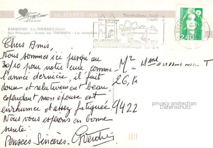 13229902 carte postale Barbotan les Thermes Parkanlagen Seerosen postalisch gelaufen Erhaltung siehe scans [KathaD81] KatCode: 11170032132013