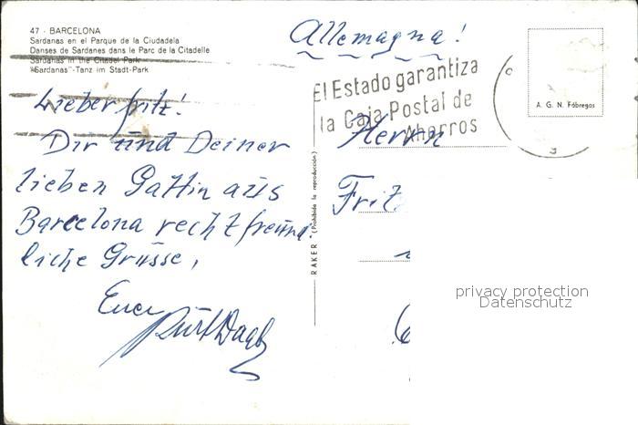 old postcard Barcelona Cataluna Sardanas Tanz im Park postalisch gelaufen Erhaltung siehe scans