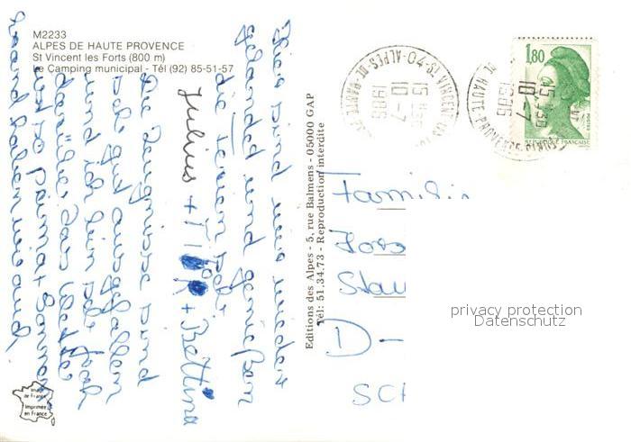 13246643 carte postale Barcelonnette Camping municipal Saint Vincent les Forts postalisch gelaufen Erhaltung siehe scans [KathaD81] KatCode: 11170004104019
