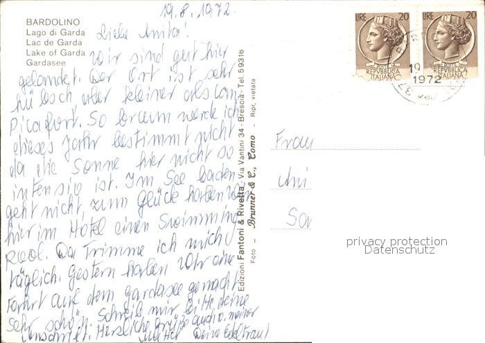 old postcard Bardolino Lago di Garda Panorama Gardasee Segelboot Weintrauben Uferpromenade postalisch gelaufen Erhaltung siehe scans