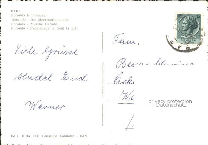 old postcard Bari Puglia Rotonda Lungomare Uferstrasse postalisch gelaufen Erhaltung siehe scans