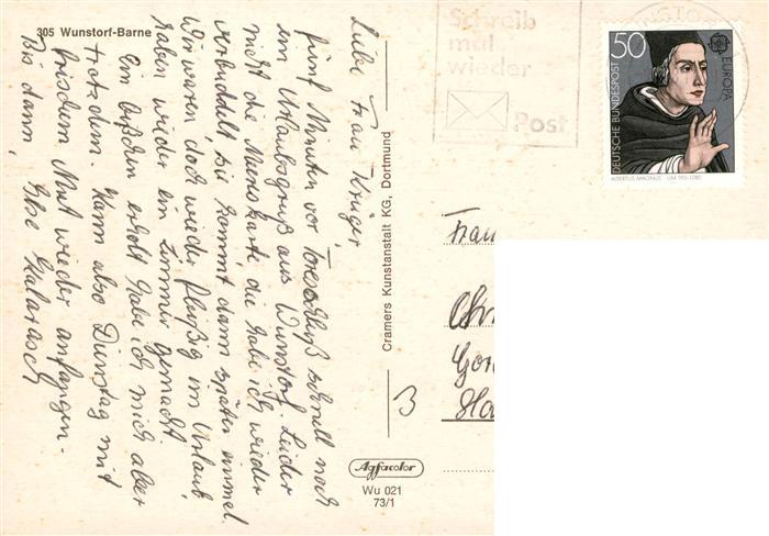 73864308 Barne Wunstorf Platz Ladengeschaeft Wohnsiedlung Hochhaeuser Plastik postalisch gelaufen Erhaltung siehe scans [FriedD77] alte Postkarte Frie Katcode 11110003241021