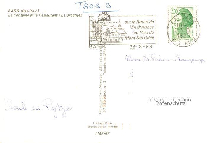 13145112 carte postale Barr Bas-Rhin Fontaine et Restaurant Le Brochet postalisch gelaufen Erhaltung siehe scans [FriedD77] KatCode: 11170067567021