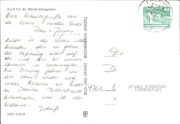 72477259 alte Postkarte Barth Hafen Rud Breitscheid Str Fangelturm Markt Brunnen postalisch gelaufen Erhaltung siehe scans KatCode: 11110013057009