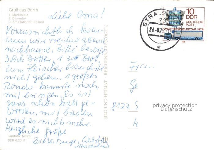 72136030 alte Postkarte Barth Marktplatz Kirche Dammtor Platz der Freiheit postalisch gelaufen Erhaltung siehe scans KatCode: 11110013057009