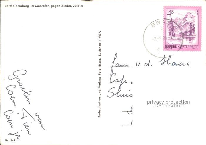72238770 alte Postkarte Bartholomaeberg Vorarlberg Kirchenpartie gegen Zimba postalisch gelaufen Erhaltung siehe scans KatCode: 11390341080101