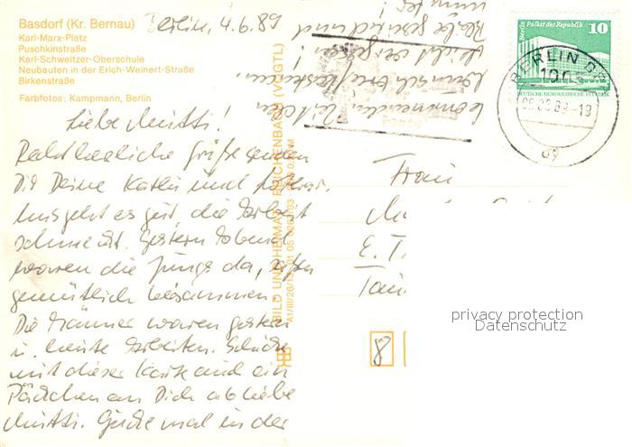 73060017 alte Postkarte Basdorf Berlin Karl Marx Platz Puschkinstrasse Karl Schweitzer Oberschule Neubauten Birkenstrasse postalisch gelaufen Erhaltung siehe scans [FriedD77] KatCode: 11110012060269